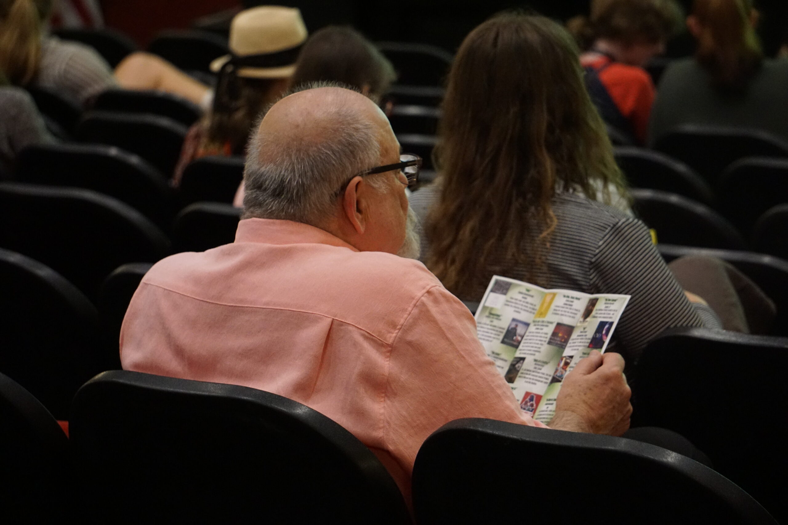 DSC05872 An attendee of the film festival waits for the proceedings to begin, and studies the schedule for the first night.