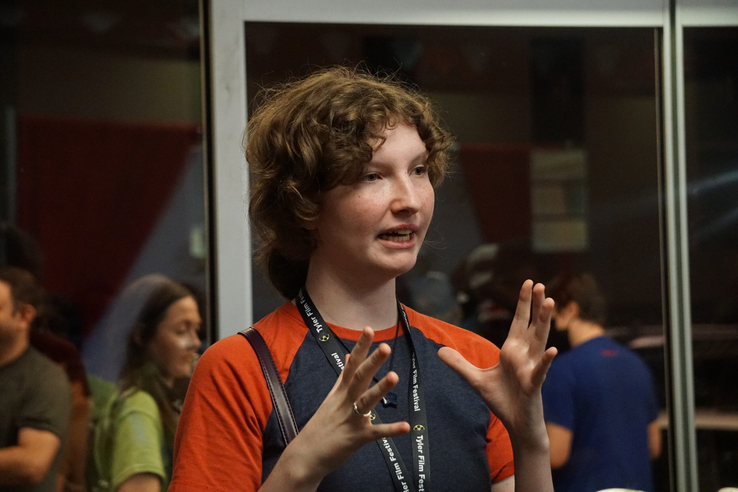 DSC06070 Emma Seagroves, a local high schooler, discusses her submission to the festival in the lobby of the Liberty Theater.